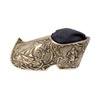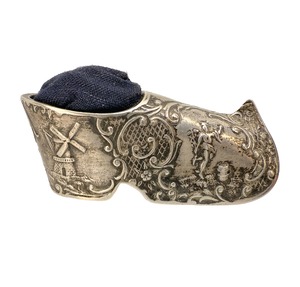 Antikes Nadelkissen SCHUH, HOLLAND, SILBER, umlaufend floral eingebettete Motive : u.a. ein Schiff, ein Schmied, eine Windmühle..., L = 63,5 mm