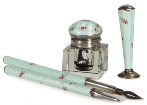 Damen Schreibset um 1890/1900, SILBER 835/000, transluziedes Email in zartem türkisblau, kleine Blüten und Blätter verteilen sich über die Oberfläche, guillochiert, 1 Tintenfäßchen; 1 Tintenfeder, 1 Bleistift u. 1 Pettschaft, H = 7,0 mm (Pettschaft mit kl. Fehlstelle)