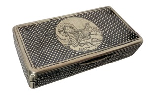 Kleine Tabakdose 1.Hälfte 19.Jhd., SILBER, signiert D u. Frauenkopfpunze nach rechts (im 6-Eck), umseitig mit feiner Nielloarbeit, zentral im Scharnierdeckel ein zart gravierter AUERHAHN, altersgemäß mit diversen Druckstellen, ca. 85,5 x 44,2 x 11,5 mm