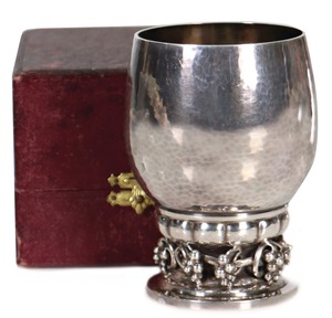 Weinbecher GEORG JENSEN aus der Collection: THE GRAPE COLLECTION, SILBER 925/000, sig. DENMARK GEORG JENSEN STERLING Modell 296 A, Entwurf um 1928, getriebener Dekor, abgetreppter Fuß mit stilisiertem Weintraubendekor, Kelch mit Hammerschlag, H = 89,2 mm, D = 72,5 mm, total 123,4 g, mit Schatulle, Becher in schönem Zustand !