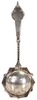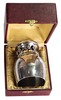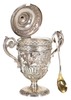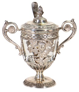A goblet-like vessel, late 1900s, SILVER 9 lot, signed PB&C, the front with scrolling vine leaves and grape handles, a mask-like face in the center, projecting handles, the top of the lid carved as an acorn, glass insert intact, h = 13.5 cm, small spoon as an addition, total 180.0 g