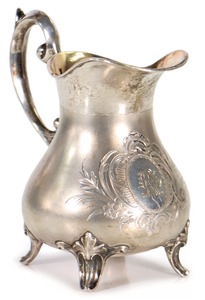 Milchkännchen um 1900, SILBER 800/000, bauchiger Korpus mattiert, vorne ausladende Gravur mit Monogrammschild, 4 ausgestellte Füße, innen vergoldet, H = 11,5 cm, total 105,6 g