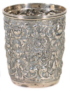 Kleiner Becher 2.Hälfte 19Jhd., SILBER 9 Lot, signiert GJ, umlaufend floral relieffiert, verschiedene Blüten, Blätter u. Ranken umspielen den gesamten Becher, am Bodenrand Druckstellen, H = 7,3 cm, D = 6,0 cm, total 60,0 g