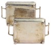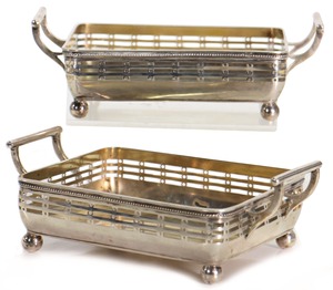 2 Schalen um 1910, SILBER 800/000, signiert W Hammer (Symbol) B (Wilhelm Binder), Korpus rechteckig aufgebaut, umlaufend graphisch durchbrochen, zwei im Bogen ausgestellte Griffe, 4 Kugelfüße (es gab wohl Glaseinsätze), ca. 16,2 x 9,7 cm, H = 5,2 cm, total 307,0 g
