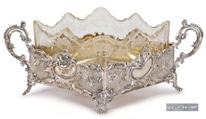 Bonboniere um 1900, SILBER 800/000, signiert W Hammer (Symbol) B (Wilhelm Binder), Bonboniere rautenförmig aufgebaut, umlaufend floral relieffiert, zwei ausladende Henkel, 4 ausgestellte Füße, innen vergoldet, Glaseinsatz am Rand geschliffen, umlaufend graviert, L = 21,5 cm (über die Diagonale), H = 8,5 cm, total 526,0 g