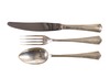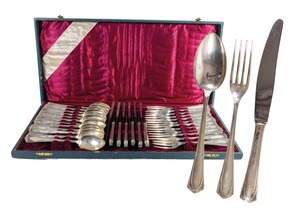 JUGENDSTIL cutlery around 1900, SILVER 800/000, sig. OHELENSCHLAGER & RIEMANN (Frankfurt court jeweler), 12 forks l = 21.0 cm ; 12 knives l = 25.0 cm and 12 spoons l = 21.3 cm, both sides with fine Art Nouveau decoration, total 1.39 kg (without knives !), with original box !
