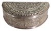 Antike halbrunde Dose 19Jhd., SILBER, Deckel mit sehr fein ausgearbeitete Oberfläche, Fries zart relieffiert, B = 97,0 mm, H = ca. 4,0 mm, Dose kann auch als Anhänger (Amulett) benutzt werden und stammt wohl aus Nepal, total 130 g