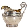 sauce boat, probably North German, c. 1820/40, SILVER 9 lot, signed DOREK, fine balanced work, the body decorated with a frieze of lion heads, the scrolled handle with the head of a bird of prey, the interior with strong gilding, h = 13.0 cm, small dent to the side, total 251.0 g