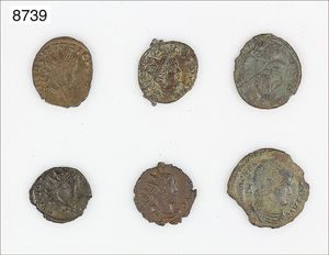 Lot: 6 Stück,römische Bronze und Kupfermünzen,u.a.Tetricus I,Tetricus II,Reg. 270-273 n.Chr. Magnentius Reg.350-353 n.Chr.