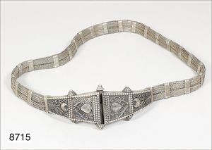 Alter indischer Gürtel, Ende 19tes Jhd., Nordwestindien, reich verzierte Schließe mit floralen und Punktmustern, vorne zu Öffnen, (an Schließenrückseite Silber eingerissen),ca. L. 72,0 cm, ca. 355,0 g