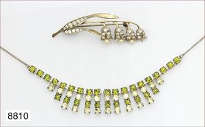 Lot: Modeschmuck, 2 Teile, Collier, Straß, Metall, 45 cm, Brosche Silber, Straß, Glasperlen