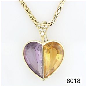 Collier, GG 585/000, Königskette geschliffen mit Karabiner, 45 cm, Anhänger GG 585/000, Brillanten 0,25 ct 0,11 ct tw-lupenrein, 1 Amethyst und 1 Citrin, total 19,5 g