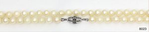 Perlenkette, WG 750/000, indiv. gearbeitete Schließe in Schweißtechnik, 1 Brillant 0,04 ct tw-si, 1 Saphir, 1 Smaragd, 2 Rubine (alle facettiert), Akoja-Perlen mit sehr schönem Lüster, D = ca. 7,0 mm, ca. Länge 57,5 cm
