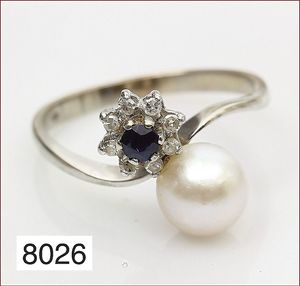 Perlring, WG 750/000, 1 Saphir, 8 Diamanten ca. 0,08 ct weiß, 1 Akojaperle ca. 7,5 mm, RW ca. 58,5