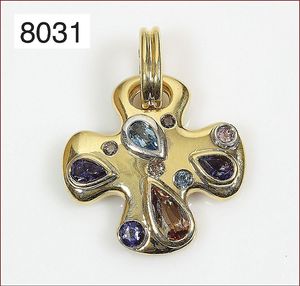 Anhänger, GG 585/000, 3 Brillanten, cognac ca. 0,08 ct, 1 Aquamarien-Tropfen, 3 Iolite/Tansanite?, 2 Topase, 1 Quarz-Tropfen, Schlaufe zum Aufklappen, ca.,25,5 x 34,0 mm