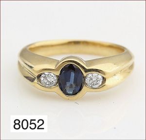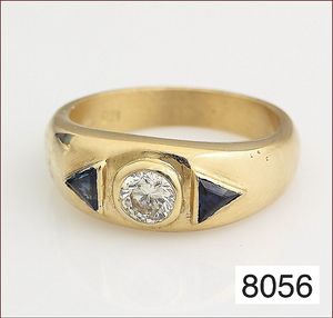 Ring, GG 750/000, 1 Brillant ca. 0,33 ct, tw/w-si, (Natural an einer Facette), 2 Saphir-Dreiecke, RW ca. 50, total 7,2 g