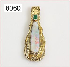 Opalanhänger, GG 333/000, sehr schöner Weiß-Opal mit viel Rotanteilen, Smaragd achteck, ca. 0,2 ct (kräftige Farbe), H = 43,5 mm, total 24,1 g