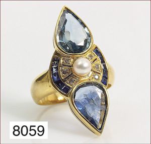 Ring, GG 916/000, 2 Saphir-Tropfen je 11 x 7,8 mm, 10 Saphircarres, 6 Brillanten 1 Perle, RW ca. 53,5