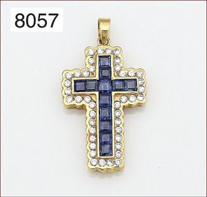 Kreuz, GG 585/000, Saphir-Carres, umlaufend weiße Steine, H = 32,2 mm