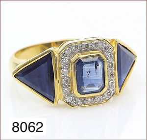 Ring, GG 22 k, 1 Saphir-Rechteck ca. 2 ct, 2 Saphir-Dreiecke ca. 9 x 9 x 9,5 mm, 18 Diamanten ca. 0,20 ct weiß, RW ca. 62