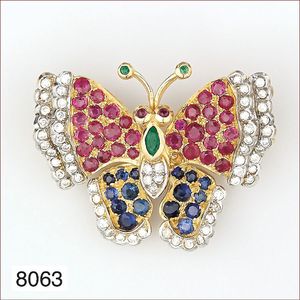 Schmetterling, Gold 750/000, 61 Brillanten ca. 0,60 ct w-vsi/si, 36 Rubine (1 Stein fehlt), 16 Saphire, 3 Smaragde, 35,5 x 28,5 mm