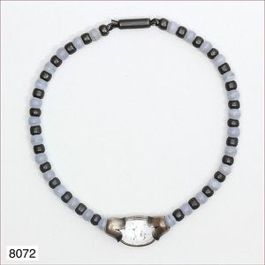 Kette, Silber geschwärzt, Calcedon-Kugeln, Mittelteil in Silber gefaßter Bergkristall, ca. 40 cm