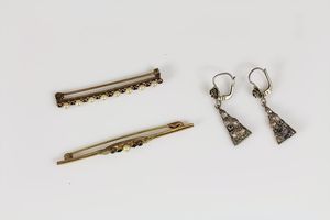 Lot: alter Modeschmuck Anfang 20. Jhd.,1 Nadeln mit roten Glassteinen u. Perlen, L = 51 mm; 1 Nadel mit blauen Glassteinen u. einer Perle, L = 66 mm,1 Ohrhänger mit mehrfarbigem Glas u. Rosenblütendekor, H = 38 mm