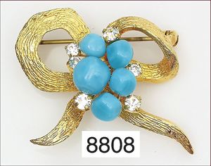 Schleifenbrosche von Dior (signiert mit der Jahreszahl 1967), türkisfarbene Glasperlchen und 6 klare Strasssteine, 38 x 32,5 mm