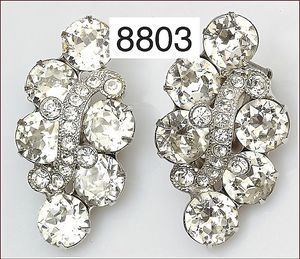 Silberfarbene Ohrclips von Eisenberg ( signiert), USA, 50er Jahre, große u, kleine gefasste Strasssteine, klar und funkelnd, H =37 mm