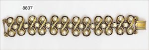 Goldfarbenes Armband von FLORENZA, USA (signiert), 50er Jahre, dunkel-goldfarbenes Metall, verschlungenes Muster, reich besetzt mit zahlreichen Kunstperlen, L = 18,5 cm