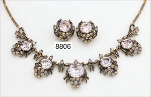 Messing-golfarbenes Collier und Ohrclips von Hollycraft signiert an den Clips mit dem Designer und der Jahreszahl 1954, gefasste zart-violette Steine im Brillantschliff und passende kleine Strasssteine in Blüten, florales Muster, Collier: L = 42 cm, Clip: D = 23 mm