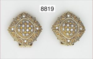 Goldfarbene Ohrclips von Grosse (Henkel & Grosse, Pforzheim) mit schöner verschnörkelter Verzierung, mit klarem und hell-orangefarbenem Pave-Strass, fächerförmig, D = 20 mm