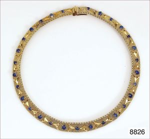 Goldfarbenes, Collier von Grosse (Henkel & Grosse,Pforzheim), sig. mit der Jahreszahl 1966, klassisches Goldband mit goldfarbigen Elementen und königsblauen gefassten Steinen, L = 41,5 cm