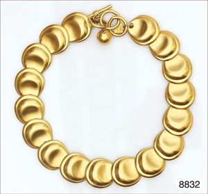 Mattgoldfarbenes Collier von Anne Klein (signiert auf dem Anhänger am Verschluß) plastisch gestaltete,scheibenförmige Kettenelemente, Knebelverschluß, L = 42 cm