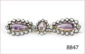 Nadel, Metall, lila und weiße Steine (Glas ?)