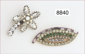 Lot: 2 Broschen, Metall, Glas, Blume ca. 4,7 cm, Schiffchenform ca. 5,7 cm