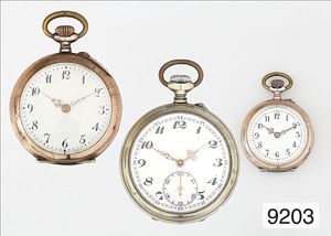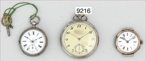 Lotvon 3 Uhren: 1 kl. Damentaschenuhr um 1900, glattes Gehäuse, Zw.Boden Metall, Silber 800/000, gravierte Rückseite mit floralem Dekor, Rand verg. E.Z. Blatt mit arab. Zahlen, feine Zeiger, Zylinderwerk, 6 Steine, D = 31,5 mm, Gehäuse mit kl. Delle auf der Seite, Uhr läuft; 1 kl. Damentaschenuhr um 1900, Silber 800/000, verziertes Gehäuse, Zw.Boden Metall, gravierte Rückseite mit Wappenschild, Rand verg. E.Z. Blatt mit röm. Zahlen, feine Zeiger, Zylinderwerk, 6 Steine, D = 30,5 mm, Uhr läuft; 1 Herrentaschenuhr, Metall, glattes Gehäuse, fein gravierte Rückseite mit Wappenschild, E.Z. Blatt mit arab. Zahlen, (feiner Haarriss), feine Zeiger, kl. Sekunde Zylinderwerk, 6 Steine, D = 43,5 mm, Uhr läuft
