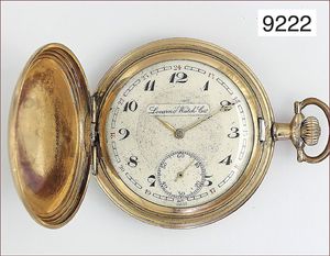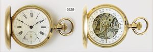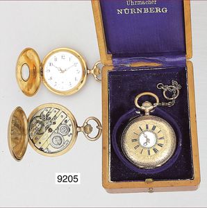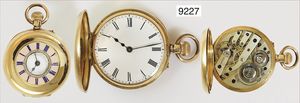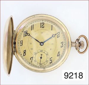 Damentaschenuhr, Half Hunter um 1910, glattes Gehäuse GG 750/000, sehr gut erhaltenes E.Z. Blatt mit röm. Zahlen und gebl. Zeigern, geschnittene Kompensations-Unruhe u. Breguetspirale, Emaille im Deckel in perfektem Zustand, D = 35,5 mm, läuft an, Reinig. bed.