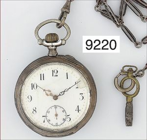 Herrentaschenuhr um 1900/1920, Metall, glattes Gehäuse, rückseitige Gravur( Jäger mit Armbrust und Kind), E.Z. Blatt in sehr gutem Zustand mit feiner Bemalung, röm. Zahlen, kl. Sekunde, Ankerhemmung, 15 Steine, Brequetspirale, D = 54,00 mm, Kette mit Karabiner & Federring, Uhr läuft