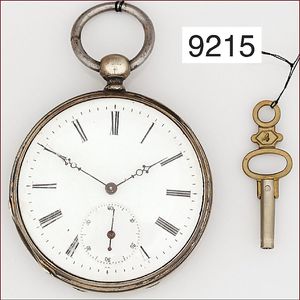 Spindeltaschenuhr, WILL LANDER LONDON 17835, England Ende um 1800. Silbergehäuse, Rückseite mit Ritter Szene, Elfenbeinzifferblatt mit Landschaftsszene: Häuser, Fluß und Berge (Zifferblatt wohl etwas später, Deckel schließt dadurch nicht korrekt), röm. Zahlen, feuervergoldetes Vollplatinenwerk mit filigran gearbeiteter Spindelbrücke, 1 Schlüssel, D = 48,5 mm, Uhr läuft