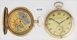 IWC Gold-Taschenuhr (826248), ART DECO um 1920, sehr flach, glattes Goldgehäuse GG 585/000, Rückseite gradlinige Gravur, Zwischenboden Metall, (Gehäuse kl. Druckstellen) sehr gut erhaltenes Ziffernblatt mit Firmensignatur, arab. Zahlen, kl. Sekunde, gebl. Zeiger, Schwanenhals-Feinregulierung, Breguetspirale, D = 58,8 mm, Uhr läuft
