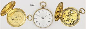 Seltene franz. Goldtaschenuhr (unbezeichnet), glattes GG 585/000 Gehäuse, doppelter Sprungdeckel, sehr gut erhaltenes E.Z.Blatt mit röm. Zahlen, kl. Sekunde, gebl. Zeiger, rückwertig interessanter Kalender, Tag / Datum, Ankerwerk mit Breguetspirale, läuft nicht, Revision notwendig, D = 49,5 mm