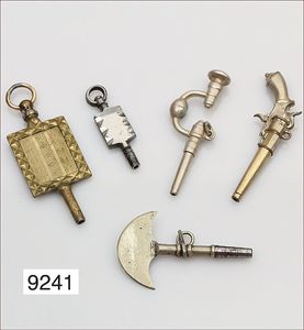 Lot: 5 Taschenuhrenschlüssel, 1 x Eisen, 2 x Metall, 1 x vergoldet,1 x Silber