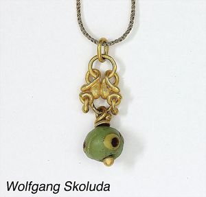Kette mit Anhänger, WOLFGANG SKOLUDA, Hamburg, GG 900/000, Anhänger mit antiker, wohl römischer oder islamischer Glasperle, H = 32 mm , Fuchsschwanz-Kette, GG 750/000, L = 40 cm