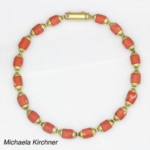 Kette, MICHAELA KIRCHNER, Heidelberg 80. Jahre, GG 750/000, Korallenastabschnitte und Goldelemente auf Silber Fuchsschwanzkette aufgefädelt, Bajonettschließe, D = 10,5 mm, L = 39,0 cm