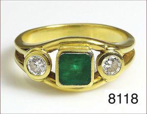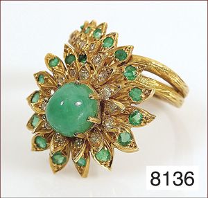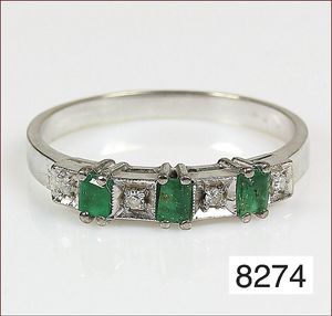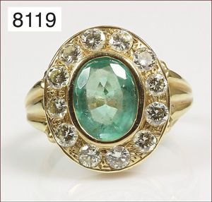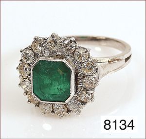 Ring, GG 585/000, Smaragdachteck ca. 5 ct, sattes grün, 12 Brillanten ca. 0,96 ct, tw-lupenrein, RW ca. 60, Expertise von 2.4.94 über DM 7000,-