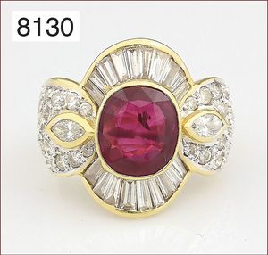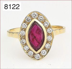Ring, GG 585/000, Rubin-Navette ca. 1,2 ct, Brillanten ca. 0,42 ct weiß-vsi, RW ca. 57