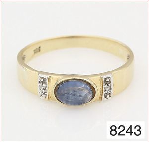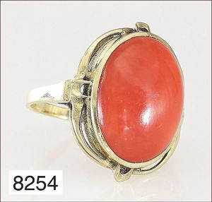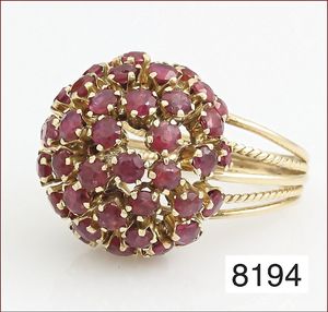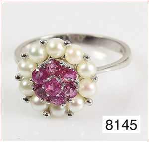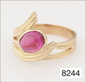 Ring, GG 585/000, Rubincabochon ca. 3,5 ct, 2 Brillanten ca. 0,26 ct, tw vsi/vvsi , 25 Brillanten im Kranz gefaßt ca. 0,17 ct weiß, RW ca. 49 cm
