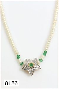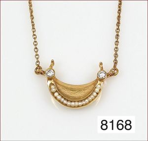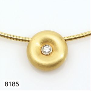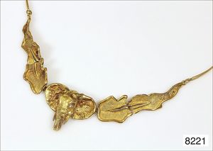 Collier, WOLFGANG SKOLUDA, Hamburg 1990 GG 900/000, Mittelteil mit antiker, wohl islamischer Glasscherbe und einem antikem Intaglio (sitzende/r Flötenspieler/in), grüner Stein (Smaragd ?), L = 40,5 cm, total 40,6 g