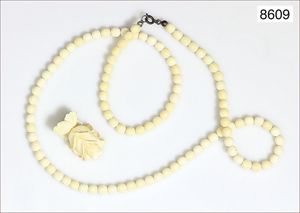 Lot: Kette, Bein vorne doppelreihig, ca. 42,5 cm, Brosche Bein mit Millefiori-Einlagen (Teil der Broschierung fehlt), Reh (Elfenbein), Anfang 20tes Jhdt.